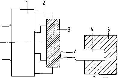 The cutting-out technique involves machining of the workpieces on their end faces and is used for specific jobs. The turning tool is moved in axial direction. The right-hand end-cut turning tool, specially ground, is mostly used (see Fig. 4 - relief-grinding of the secondary cutting edge to avoid "dragging" of the tool).