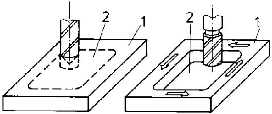 - Scratch and set the length and width of the break-through (stops at machine table and saddle or at machine table and knee), rough-mill the break-through with small cutting depth (0.5 - 1.0 mm).