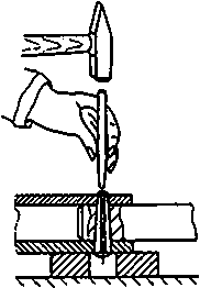 Pins in through holes can be driven out by several blows onto a drift (of a nominal diameter somewhat smaller than that of the pin). Apply the blows in the opposite direction of driving in the pin. Make sure that there is a larger hole in the support through which the pin can slip.