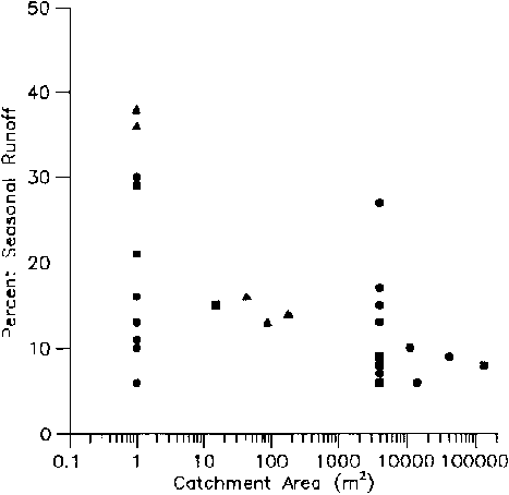 The scale of these catchments is larger than is often studied for agrohydrological research, but Figure 6.7 shows a graph of catchment size versus percent runoff, the data for which were obtained from experimental plots and catchments sited in and around farmers' fields. These plots are divided into three groups with similar catchment conditions, to remove any influence that different conditions could exert on runoff. The conditions are crop (squares); rangeland (triangles) and fallow (circles). The R2 of the analyses were 0.108, 0.066 and 0.602 respectively and none of the relations were significant.