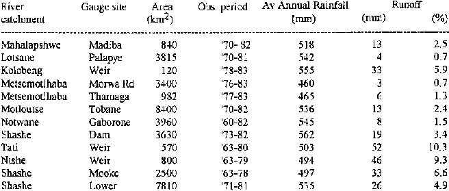 Natural vegetation can be very important in determining runoff amounts; in many instances it is the most important influence of all, after rainfall. Areas bare of vegetation can lose more than 40% of seasonal rainfall through runoff and for intense, individual storms the loss can be much greater. Areas with dense grass cover and tree canopy cover can retain as much as 99% of the rainfall that reaches the ground. Vegetation reduces the energy of raindrops making them less erosive and intercepts rainfall which is then re-evaporated. Thus natural vegetation works against the occurrence of runoff in several ways. The same can be said of crops, but most crops provide only temporary cover and their densities, especially at ground level, rarely attain that of natural vegetation. Examples of increased runoff, soil erosion and subsequent land degradation due to the removal of natural vegetation, are common throughout the world and the literature. Consider the data presented below in Table 6.1, which compares runoff from different rangeland catchments of the same size catchments, but with various densities of vegetation cover.