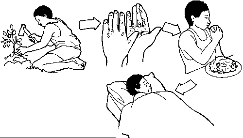 Another case of water-washed disease could happen when excreta, such as animal manure, is used as fertiliser in gardens. Vegetables from such gardens may carry micro-organisms causing illness. If the vegetables are not carefully washed before they are eaten, disease may be spread. The gardener working in the garden may also have micro-organisms on his hands. He must always wash his hands after working and before eating.