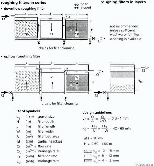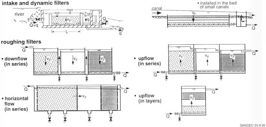 As shown in Table 1, filters can be classified according to filter material size and filtration rate into the following categories: rock filters, roughing filters, rapid sand filters and slow sand filters. Roughing filters, using mainly gravel as filter medium, are operated without chemicals and do not require sophisticated mechanical equipment for operation and maintenance. Nevertheless, their design and application vary considerably. The different roughing filter types are classified according to: