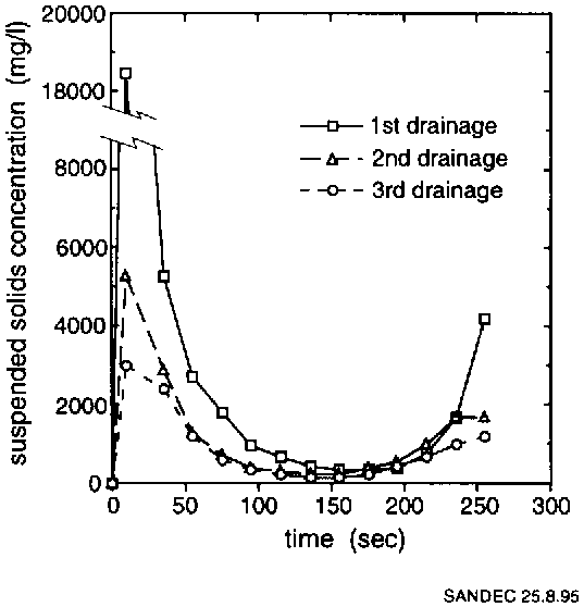 All of a sudden, the quiescent and dull conditions stopped. The filter was filled with tremendous noise which felt worse than a giant earthquake. The water was shooting downwards through the gravel to the filter bottom, and all the clay particles were anxiously holding each other. A side of his structure was flushed away. Our terrified particle then saw a clump of particles roll down like an avalanche. The dragging forces grew stronger, his structure collapsed and then everything went very fast. Under very turbulent flow conditions, he was flushed to the filter bottom, pressed through a pipe where a valve nearly broke his neck, and was finally discharged into a lagoon. Our old fellow gained his liberty and felt like a new-born. However, he was not used to the bright sunshine and decided to settle again, but this time under different conditions.