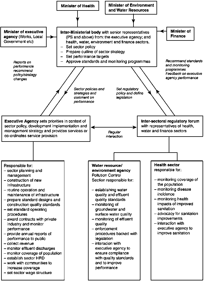 The development and optimisation of the institutional framework in the water sector is essential for effective, output driven water quality monitoring. Unless the roles and responsibilities of each player are established and recognised, then the generation of monitoring data and information may not lead to the desired improvement in water supplies.