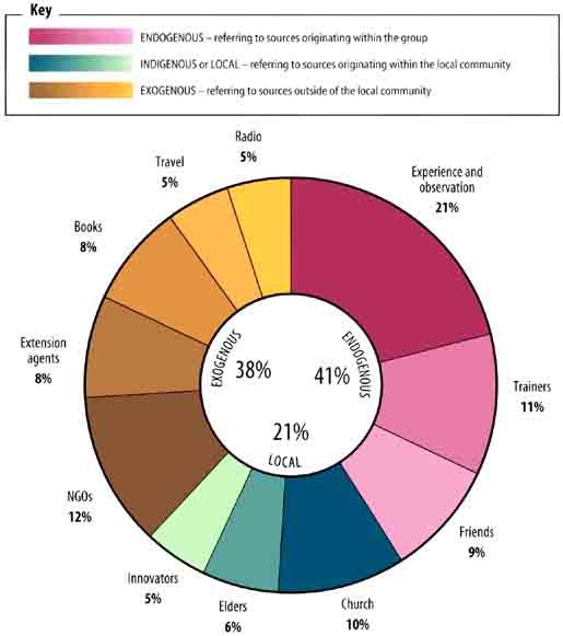These are sources outside the local community and include NGOs, extension agents, radio (usually national broadcasts but in local languages), newspapers, books, travel, and government training colleges and research stations.