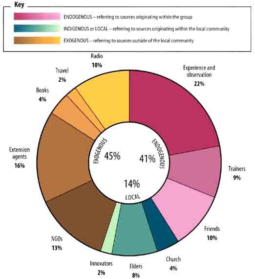 Within Uganda over two thirds of new ideas, and in Ghana just over half of the most frequently used sources of new information came from within the local community or group. This implies that many groups had to rely largely on their own resources and ideas but this was not necessarily through choice. No group ever mentioned refusing a visit from any outsiders. Indeed from the reception given to visitors in almost all groups, it was clear that such visits are rare. In Ghana, significantly more exogenous sources were selected, largely due to the apparently increased effectiveness of both the extension services and local radio broadcasts. There was little variation between the value placed on sources within the group which indicated a substantial level of confidence among the members, both in their own knowledge and experience and that of other members.