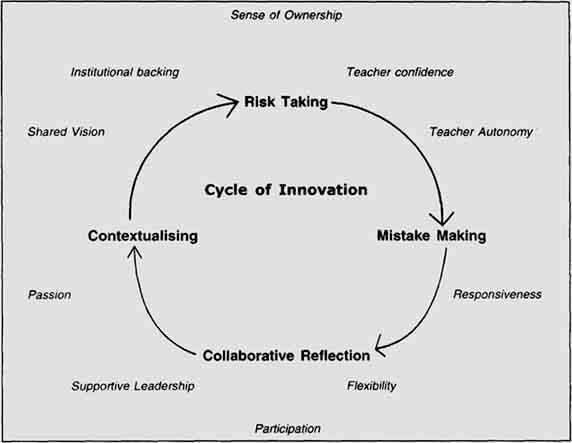 Contextualisation happens where the change idea has been redefined by a process of collaborative reflection. The fourth phase in the change loop enables change to take root in context in an integral and appropriate way. An example of this has been in the development of alternative curricula and methods for streetchildren, drawing on their own context and experience, rather than orthodox narratives, nursery rhymes and whole class type teaching. So for example, one-to-one tutoring is more suited to the needs of streetchildren whose attention spans in groups are limited to begin with. Similarly, games and stories involving street life, such as hawking, gambling, famous movie stars and survival skills, are incorporated into the curriculum. The change cycle continues as further risks are taken in re-inventing aspects of the innovation, often by trial and error. The diagram overleaf illustrates this process.