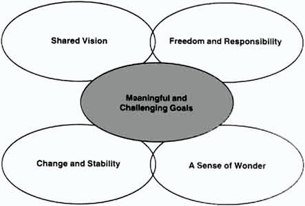 The manifestations of best practice to which this report refers would have little resonance or reality without the final indicator of good practice, that is, the setting of meaningful and challenging goals. A shared vision, freedom and responsibility, change and stability, and a sense of wonder all acquire their value from this central notion, that pupils and staff are being challenged to participate in what they consider to be a substantial and worthwhile endeavour.