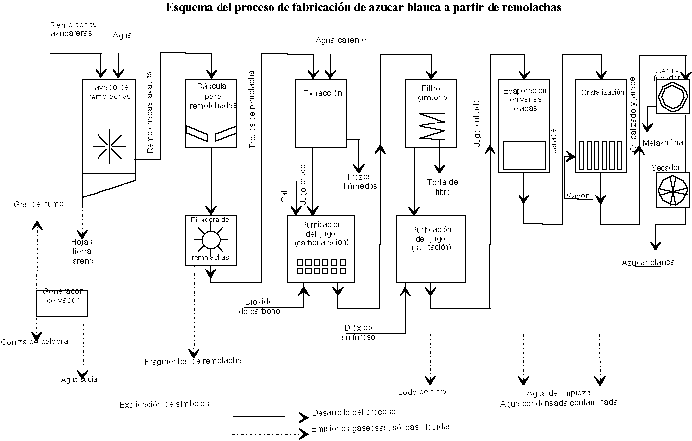 Esquema del proceso de fabricación de azúcar blanca a partir de remolachas