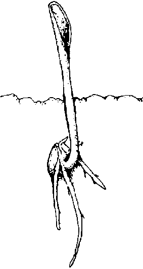 (Izquierda) Una planta de semillero de maíz en estado de emergencia; note que tiene sólo un lóbulo, lo que lo identifica como monocotiledónea. Las monocotiledóneas emergen del suelo con una espiga. Generalmente tienen menos problemas con los terrones y el polvo que las dicotiledóneas.