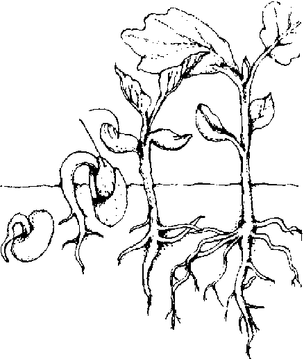 (Derecha) un planta de frijoles en germinación; note los dos cotiledones (lóbulos) que originalmente formaron las dos mitades de la semilla
