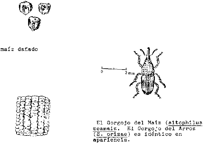 El Gorgojo del Maíz (Sitophilus zeamais), El Gorgojo del Arroz (S. oryzae), y el Gorgojo Granero (S. granarius): Todos tienen hocicos largos y tienen cuerpos de 8.3 mm de largo. Sólo los gorgojos del maíz y del arroz pueden volar e infestar los cultivos en el campo. Las hembras viven varios meses y ponen entre 20,0-400 huevos, perforando huecos en el grano y poniendo los huevos adentro. Las larvas blancas sin patas se alimentan del interior del grano, se desarrollan en pupas, y emergen en forma de gorgojo. Las tres especies son más comunes en las regiones húmedas que en las secas.