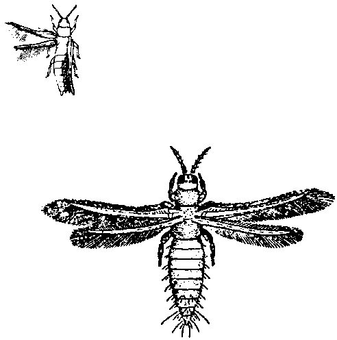 Trips: Estos insectos pequeños (1 mm) de color variante de amarillo a negro tienen dos pares de alas frágiles que están bordadas con pelos al borde anterior. Los trips inmaduros, (ninfas) son de color amarillo claro a anaranjado y más pequeños que los adultos. Cuando se alarman saltan. Pueden causar problemas serios puesto que se alimentan de los capullos o las hojitas dobladas. Tienen partes mandibles raspadoras-chupadoras que pueden causar cicatrices y distorciones en las hojas en desarrollo Los trips también pueden diseminar el virus del marchitamiento clorótico.