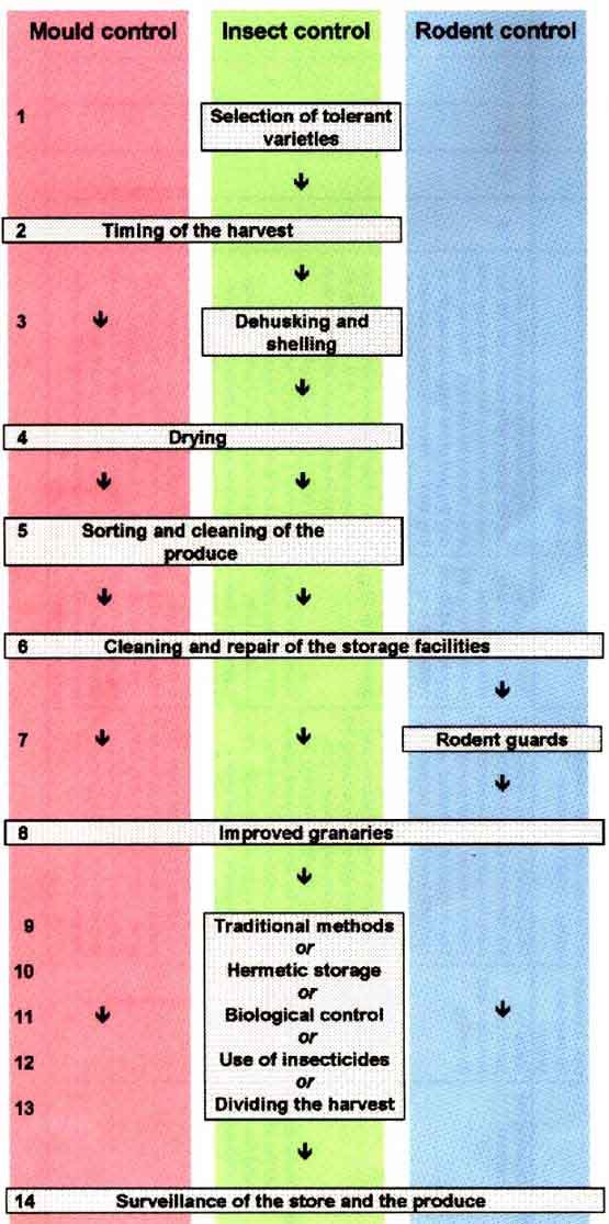 Integrated post-harvest protection on the farm level means the selection of appropriate measures according to the specific situation on every single farm. Integrated post-harvest loss prevention combines profitability with the protection of the natural resources. There are various possibilities to reduce or completely avoid the use of chemical stored product protectants. It is the task of the farmers and the extensionists to analyse the needs carefully before choosing the measures that suit them best. Criteria like simplicity, availability, cost, labour expense must always be taken into account. In this context, the extension brochure is intended to contribute to post-harvest loss reduction and to the improvement of food security.
