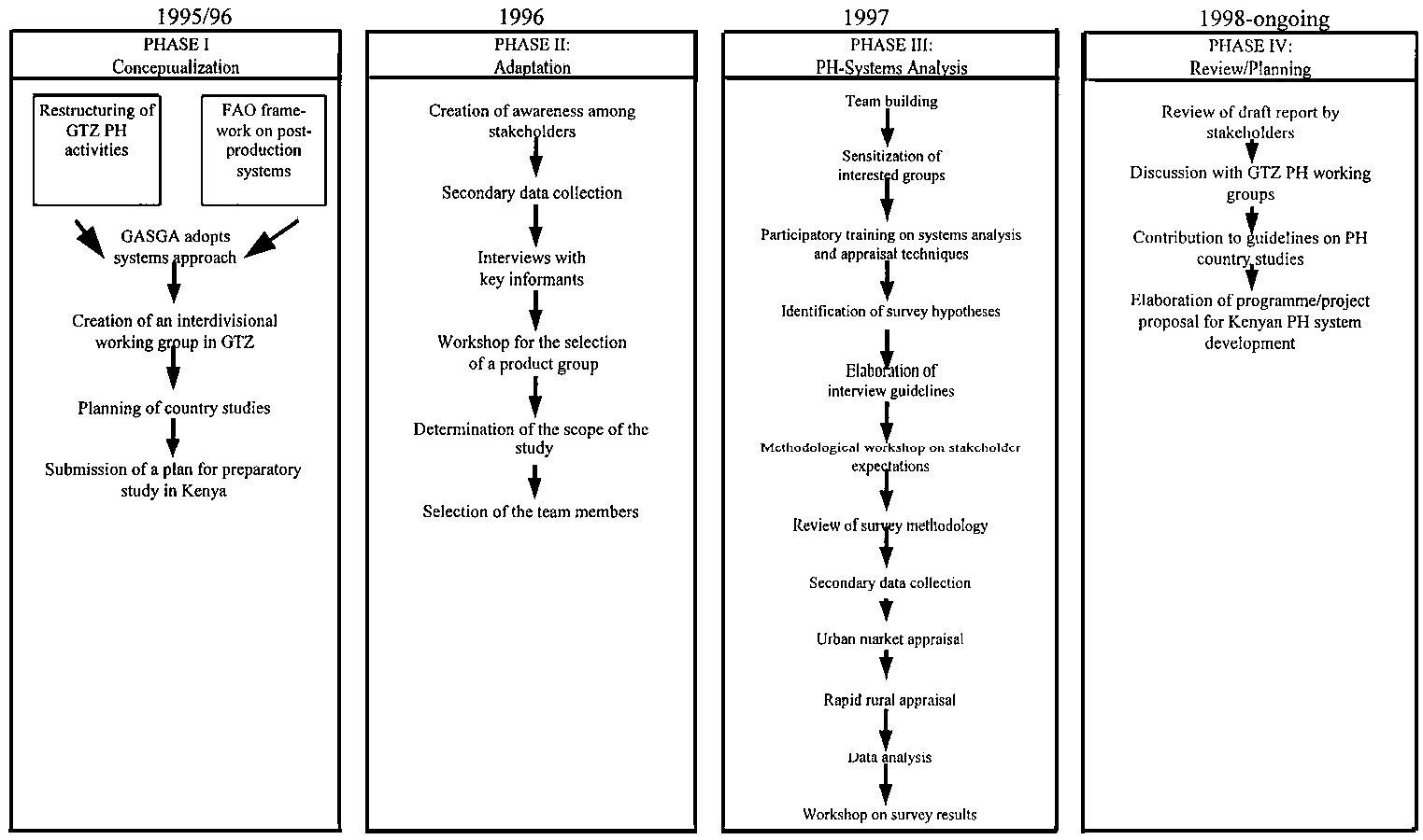 This country study is a component of a four-stage process (see figure 1). Phase 1 consisted of the conceptualisation of the systems approach. In phase 2, the adaptation of the theoretical framework to the specific conditions of Kenya was made during a preliminary mission (Fleischer 1996). This included the creation of awareness and the selection of an appropriate commodity group. The present report presents the results of phase 3 which covers the field research and data analysis. This shall be followed by a review phase.