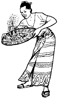 Winnowing takes place after decortication, and is the separation of the husks or seed coat from the oil-bearing material. Traditionally, this operation is achieved by gently throwing the seeds into the air and letting the air blow away the husks. This method of winnowing requires skill and experience. For higher rates of production, it is possible to use either a manual or a powered winnowing machine.