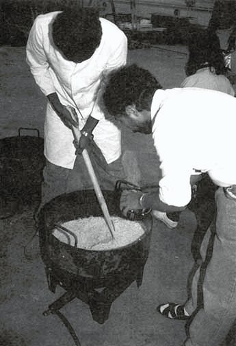 The desired moisture content will differ, according to the raw material being used. For example, groundnut flour needs an addition of 10 per cent water and is heated at a temperature of 90°C. The heating is traditionally carried out over open fires, although seed scorchers, which are basically pans fitted with stirrers, are now available to mix the nuts/seeds better.