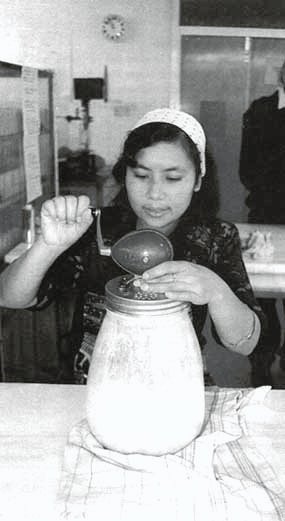 The milk is cooled to between 30 40°C and inoculated with a mixed culture of Lactobacillus bulgaricus and Streptococcus thermophilus (usually in a ratio of 1:1). If a commercial starter-culture is used, the directions for use will be given. However, if a culture from a previous batch is used, then it is usual to add 2-3 tablespoons per litre of prepared milk.