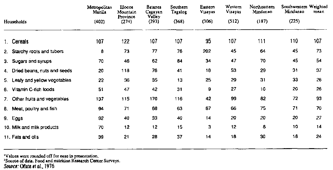 Root crops make an important contribution to the diet of many people in tropical countries, being consumed, as in the case of cassava, as a basic source of low-cost calories, or as a supplement to cereals. The cost of calories from cassava is about 25 to 50 percent that of the locally produced traditional grains and pulses (Goering, 1979), but other root crops, such as yams, are considerably more expensive. In most developing countries the dietary staples consist of starchy foods, which usually include some root crops. As indicated in Table 3.6, tropical roots may supply from as much as 1 060 calories per caput per day, (56 percent of the total daily calorie intake in Zaire), to as little as 200 calories (eight percent of the total daily intake in Belize).