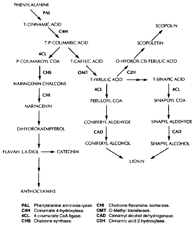 The phenylpropanoid pathway is responsible for the biosynthesis of phenolic compounds (Figure 13) and it has been the subject of much research in different plant systems. The phenylpropanoid pathway is involved in many aspects of wound response including the production of isoflavonoid phytoalexins, flavonoid pigments, ultraviolet protectants and the generation of lignin and suberin (Hahlbrock and Scheel, 1989). Phenylalanine ammonialyase controls the key initial entry into the phenylpropanoid pathway and genes for this and other associated enzymes can begin transcription within two to three minutes of wounding or elicitor treatment (Lorenzo et al., 1987; Fritzemeier et al., 1987). Two enzymes from this pathway, phenylalanine ammonia-lyase and 4coumarate: CoA ligase, have been shown to be differentially induced by wounding (Lois and Hahlbrock, 1992).