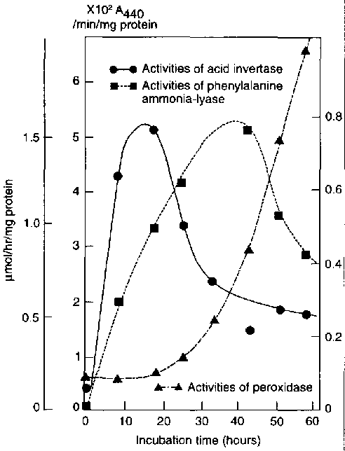 FIGURE 14 Timecourse of changes in activities of acid invertase, phenylalanine ammonia-lyase and peroxidase in cassava (cv. Golden Yellow) in response to cut injury. Tissue disks were 2mm thick.