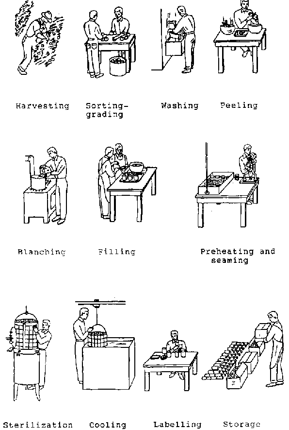 Food preparation: | Preparation procedures will vary with the type of food. For fruit, washing, sorting, grading, peeling, cutting to size, pre-cooking and pulping operations may be employed. |