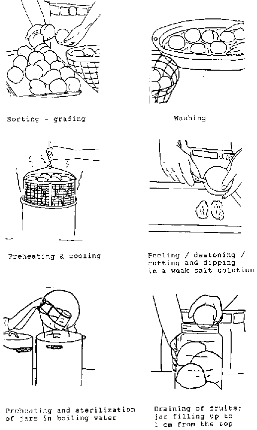 Fig. 5.6.1 (see Figure 5.6.1 Simplified and illustrated flow-sheet of the operation cycle for fruit and vegetables heat preservation) shows a simplified and illustrated flow-sheet of the operation cycle for fruit and vegetable heat preservation. Fig. 5.6.2 (see Figure 5.6.2 Illustration of technological steps for preservation of fruits in glass jars: Peaches and Figure 5.6.2 (continued)) is an illustration of technological steps for preservation of fruits in glass jars.