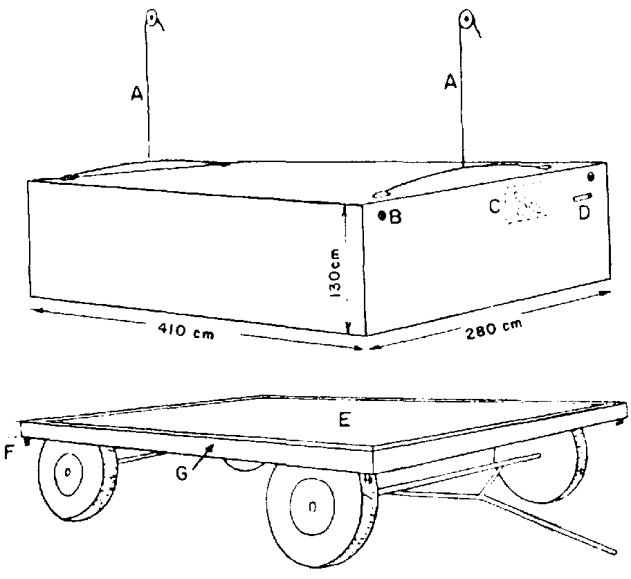 There is room for very wide variation in the design of atmospheric fumigation chambers. The fumigant to be used, the siting and size of the chamber, the type of goods and methods of handling, the availability of building materials, as well as the expenditure that can be allowed for increased efficiency and ease of operation, must all be taken into consideration. If chambers are used constantly or are loaded with heavy materials, a sturdy construction is necessary (Figure 22). However, light, portable chambers made from plywood or similar material may be appropriate for some types of treatment. A simple portable plywood chamber that was designed for travel from one forestry nursery to another is illustrated in Figure 23.