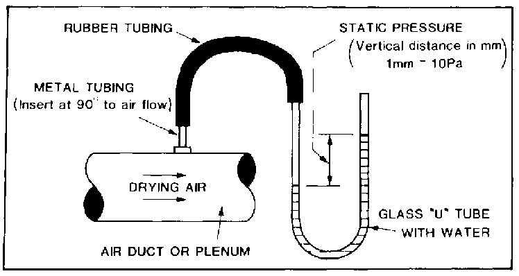 To test a sealed structure by the pressure decay method, air is introduced by the gas introduction system from a blower capable of producing 6 m/min (212 ft³/min) at 2 500 Pa (10 in water gauge). Pressure differentiels can be measured conveniently on a portable water gauge similar to that shown in Figure 43. If a pressure of 2 500 Pa cannot be reached with such a blower, there may be too much restriction between the blower and the bin or the bin is less gas tight than required (e.g. 3.1 m/min at 2 500 Pa for a 2 000 tonne bin). Care should be taken to ensure that pressure within the bin does not exceed the engineering limitations of the bin or of the sealing that is used. When a pressure of 2 500 Pa or the design limit is achieved, air input is cut off in such a way that no air is lost back through the blower. Pressure decay on the water gauge is then related to the period of time involved.