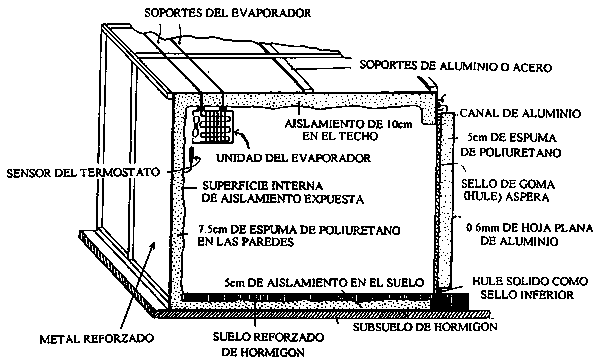Una cámara de enfriamiento económica puede construirse usando hormigón para el piso y espuma de poliuretano como aislante. La construcción del almacén en forma de cubo reducirá el área de la superficie por unidad de volumen del espacio de almacenamiento, disminuyendo así los costes de refrigeración y construcción. Todas las juntas deberán estar reforzadas y la puerta deberá tener un sello de caucho.