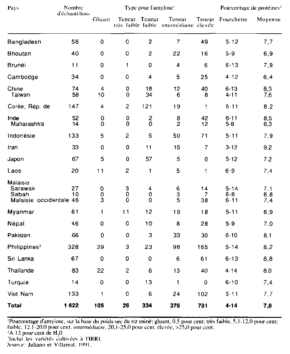 Dans les pays d'Asie, les riz à forte teneur en amylose prédominent (tableau 21). C'est le type de riz principal au Bangladesh, à Sri Lanka, en Thaïlande et au Viet Nam. Le riz à teneur en amylose intermédiaire prédomine au Bhoutan, au Myanmar et au Pakistan, tandis que le riz à teneur faible en amylose prédomine dans la province chinoise de Taiwan, au Japon et en République de Corée. Les riz à très faible teneur en amylose n'ont été observés qu'au Brunéi, en Indonésie, en République de Corée, au Laos, au Sarawak (Malaisie), au Myanmar, aux Philippines et en Thaïlande. Les riz gluants sont représentés en Chine, en Indonésie, au Japon, en République de Corée, au Laos, en Malaisie occidentale, au Myanmar, aux Philippines et en Thaïlande. Le riz gluant est la denrée de base au Laos et dans le nord et le nord-est de la Thaïlande.