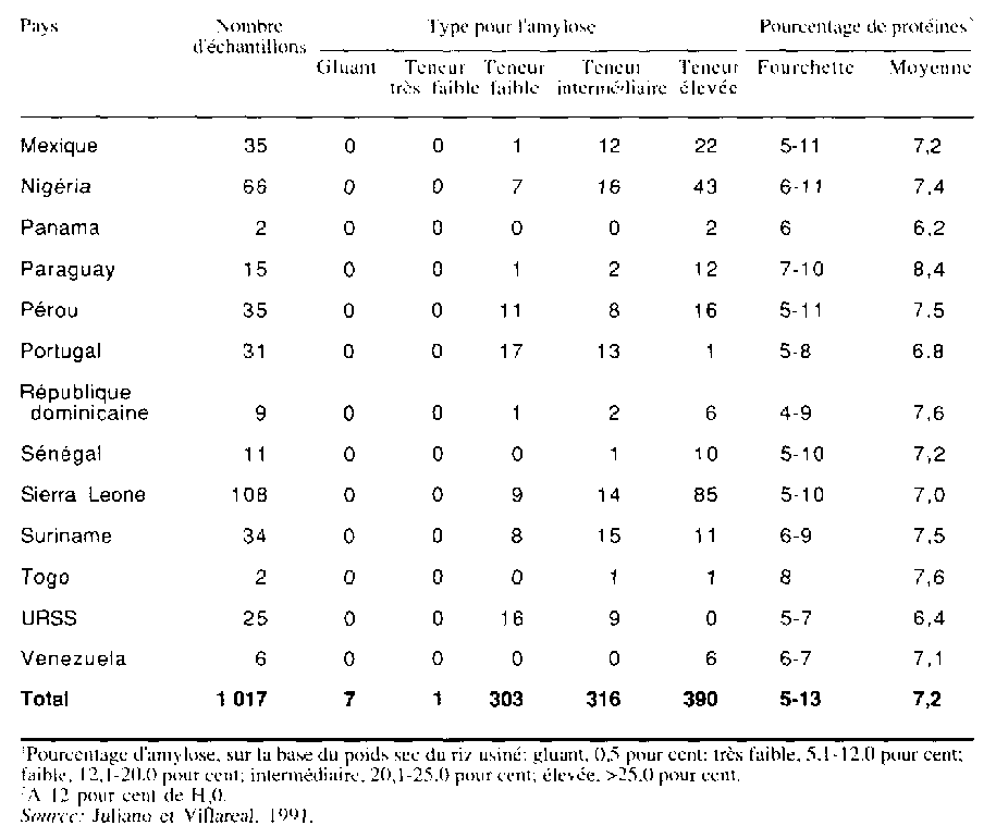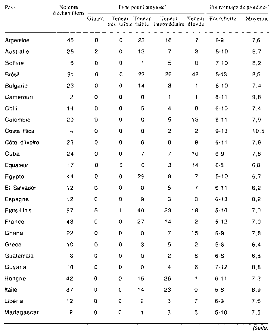 Pour les variétés cultivées en dehors de l'Asie, les riz à teneur en amylose faible, intermédiaire ou élevée sont représentés à égalité (tableau 22). Les riz àforte teneur en amylose prédominent en Colombie, au Ghana, au Guatemala, au Nigéria, au Paraguay, au Pérou, en Sierra Leone et au Venezuela. Les riz àteneur intermédiaire en amylose prédominent au Chili, en Grèce, en Hongrie, en République islamique d'Iran, en Italie, au Suriname et au Venezuela. Les riz àfaible teneur en amylose prédominent en Argentine, en Australie, en Bulgarie, en Egypte, en France, au Portugal, en Turquie, aux Etats-Unis et dans l'ex-URSS. Seuls les Etats-Unis ont un riz à très faible teneur en amylose et on y cultive des riz gluants, de même qu'en Australie. La teneur en protéines des échantillons de riz usiné cultivé en dehors de l'Asie variait de 5 à 13 pour cent et les valeurs moyennes de 6,2 à 10,5 pour cent (tableau 22). La teneur moyenne en protéines est de 7,2 pour cent, c'est-à-dire plus faible que pour le riz asiatique (tableau 21).