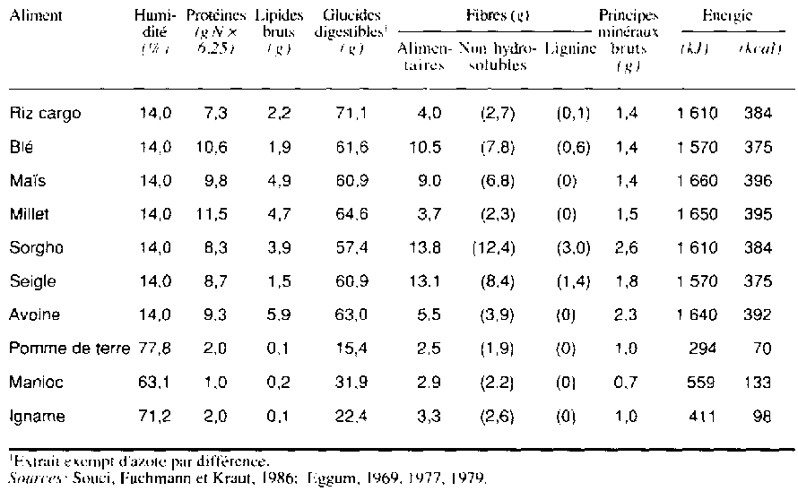 chimique plus élevé de la pomme de terre, mais pour cette denrée l'utilisation protéique nette (UPN) est plus faible que pour le riz Les protéines utilisables étaient sensiblement identiques pour le riz cargo, le blé, le maïs, le seigle, l'avoine et la pomme de terre, mais inférieures pour le sorgho et plus élevées pour le millet. C'est le riz qui a la plus forte digestibilité d'énergie cela étant probablement dû en partie à sa faible teneur en fibres alimentaires et en tanin (tableaux 24 et 26)