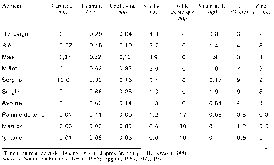 La comparaison entre la teneur en nutriments des céréales de base avec 14 pour cent d'humidité et des tubercules alimentaires à plus forte teneur en humidité (tableaux 24 à 27) révèle une teneur légèrement plus élevée en énergie dans les céréales (tableau 24), mais une teneur plus élevée en acide ascorbique dans les tubercules (tableau 25). Le manioc a une teneur en protéines extrêmement faible (tableau 24), même après correction pour tenir compte des différences d'humidité. Le riz a la même teneur en protéines que la pomme de terre et l'igname sur extrait sec, mais de toutes les céréales c'est le riz qui a la teneur la plus faible. Le riz a également la teneur la plus faible en fibres alimentaires. L'analyse des acides aminés (tableau 26) a montré que le premier acide aminé essentiel limitant dans les protéines de céréales était la lysine, la teneur en lysine étant la plus élevée dans l'avoine et le riz parmi les protéines céréalières (Eggum, 1979) (tableau 26). En revanche, les protéines des tubercules ont une teneur suffisante en lysine, mais il y a carence d'acides aminés soufrés (cystéine et méthionine), en particulier aux niveaux protéiques élevés (Eppendorfer, Eggum et Bille, 1979; Food and Nutrition Research Institute, 1980). La qualité protéique de la farine complète de maïs était comparable à celle du blé en raison du grand germe qui a une forte teneur en protéines riches en lysine La valeur calculée en acides aminés (indice chimique), d'après le modèle OMS/FAO/UNU (OMS, 1986), a révélé que les protéines des tubercules étaient supérieures aux protéines céréalières, sans toute fois qu'il soit tenu compte de la digestibilité réelle. Les tubercules contiennent davantage d'humidité que les céréales, de sorte que la densité de nutriments et d'énergie est moindre.
