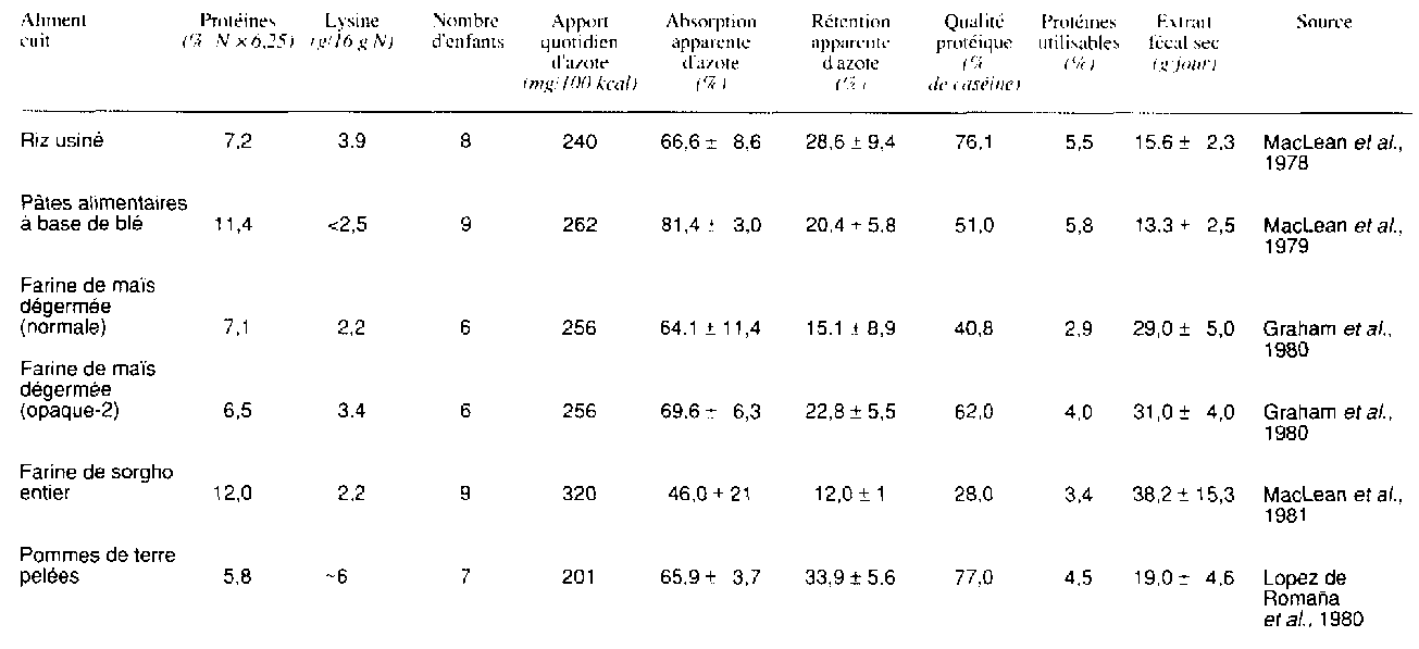 Des études sur le bilan azoté effectuées chez des enfants péruviens d'âge préscolaire nourris de céréales cuites (Graham et al., 1980; MacLean et al., 1978,1979,1981) et de pommes de terre (Lopez de Romaña et al., 1980) ont révélé que l'absorption apparente d'azote était la plus élevée pour les pâtes alimentaires faites de blé, mais que la rétention apparente d'azote était la plus élevée pour la pomme de terre pelée et que la qualité protéique la plus élevée, d'après la rétention apparente d'azote avec des rations témoins de caséine, était constatée avec la pomme de terre et le riz usiné (tableau 29). Le chiffre le plus élevé pour les protéines utilisables a été relevé pour le blé et le riz. La qualité des protéines est inférieure pour le maïs opaque-2 ou à forte teneur en lysine par rapport au riz usiné, mais elle est meilleure que pour le maïs normal. La digestibilité énergétique calculée en poids d'extrait fécal sec était la plus faible pour le sorgho, probablement àcause de sa forte teneur en tanin (tableau 26).