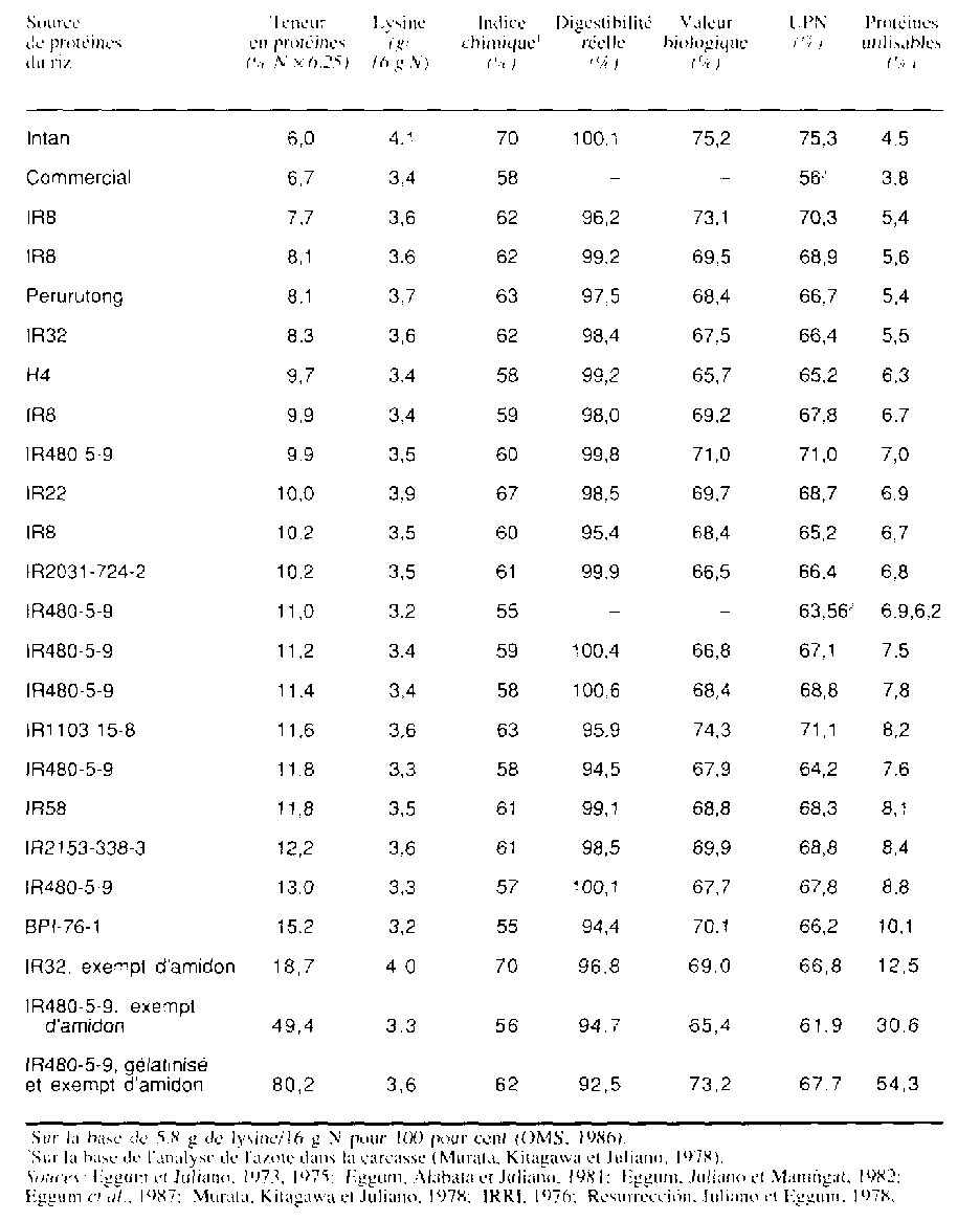 La valeur habituellement attribuée à la teneur du riz usiné en protéines est de 7 pour cent, sur la base d'un facteur de conversion Kjeldahl de 5,95. Toutefois, pour les études nutritionnelles on utilise le facteur de 6,25 pour que le bilan azoté du régime alimentaire corresponde à celui des protéines types. La digestibilité réelle des protéines de riz cuit est de 88+4 pour cent chez l'homme (OMS, 1985) (tableau 28). Leur indice chimique est d'environ 65 pour cent sur la base de 5,8 pour cent de lysine pour 100 pour cent (OMS, 1985). Chez les rats, l'utilisation protéique nette de riz usiné est d'environ 70 pour cent (Eggum et Juliano, 1973, 1975). Chez les rats en croissance, la valeur biologique est d'environ 70 pour cent pour le riz cru et d'environ 80 pour cent pour le riz cuit (Eggum, Resurrección et Juliano, 1977).