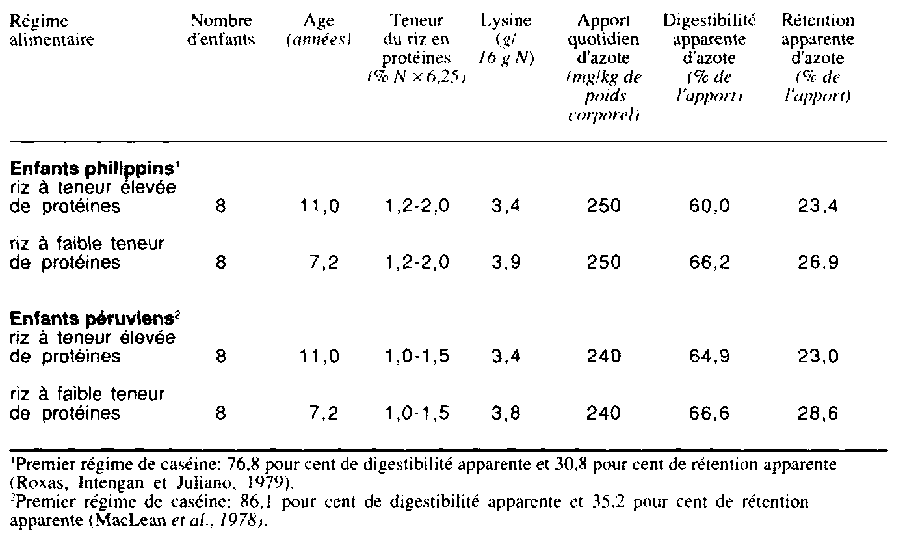 Ces épreuves sur le rat ont été vérifiées par des études sur la correspondan ce du bilan azoté chez des enfants d'âge préscolaire au Pérou (MacLean et al., 1978) et aux Philippines (Roxas, Intengan et Juliano, 1979) (tableau 32). Bien que la rétention d'azote apparente ait été quelque peu inférieure pour le riz àhaute teneur en protéines, la diminution ne représentait qu'une fraction de l'augmentation de cette teneur. Des études à court terme sur le bilan azoté ont également révélé une augmentation de la rétention apparente d'azote quand le riz à teneur moyenne en protéines (7,5-7,8 pour cent) était remplacé par un poids égal de riz à haute teneur en protéines (l 1,4-14,5 pour cent); chez les adultes, elle est passée de 3,6 à 11,7 pour cent avec un régime alimentaire composé de riz (Clark, Howe et Lee, 1971) et de 27,7 pour cent à 29,8 pour cent avec un régime composé de riz et de poisson (Roxas, Intengan et Juliano, 1975); chez les enfants, elle est passée de 21,6 pour cent à 31,6 pour cent avec un régime composé de riz et de haricots mungo à grains verts (Roxas, Intengan et Juliano, 1976) (tableau 33).