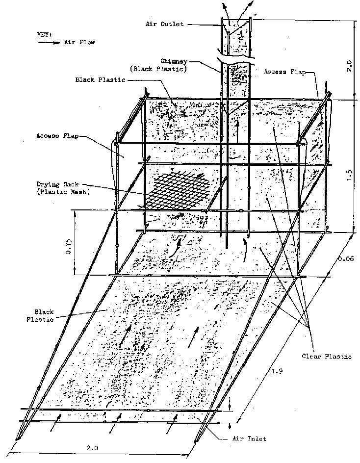 The drier employed has been described in detail by Trim and Ko (1982) and is illustrated in Figure 5 (see Figure 5. Forced Convection Solar Drier - Source: Trim and Ko (1982)). Essentially it consists of: a frame made of bamboo; an outer covering of clear plastic and an inner covering of clear plastic and an inner covering of black plastic, separated by a distance of approximately 10 cm; and a fan/ducting system to draw air from one side of the wall cavity which distributes it within the dryer, and expels it through the roof. Peppers are placed on drying racks constructed from plastic mesh stretched on bamboo frames. The total rack area is 22 m² and a loading of approximately 14 kg/m² of whole peppers is attained.