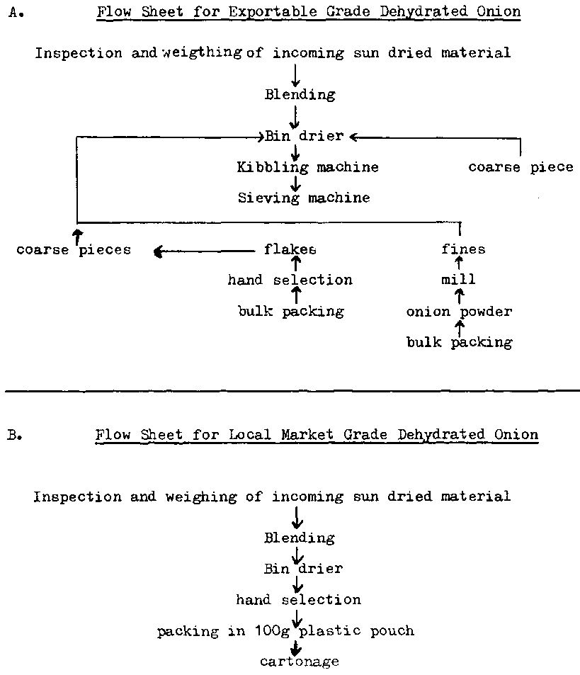 The flow sheet B for local market grade dehydrated onion, packed in plastic pouches of 100 g, is vary much simpler than the flow sheet recommend d for export grade. This should result in an attractive price to the consumer.