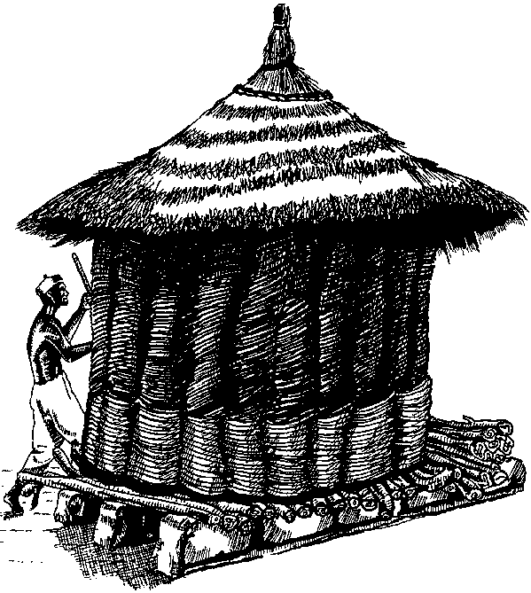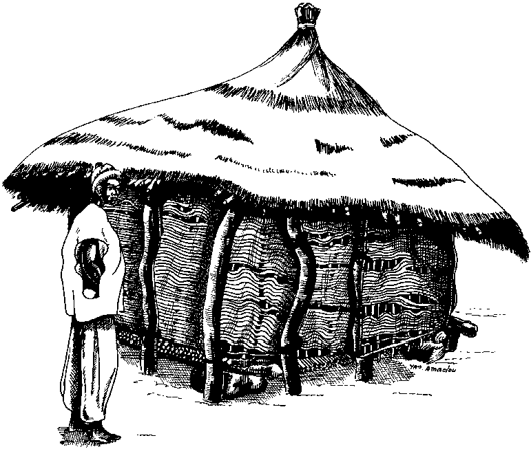 Chez les Sérère et les Wolof, les épis de mil sont normalement stockés dans des greniers en Nguer (cf. figure I.1). Il s'agit d'une structure cylindrique, faite entièrement de matériaux végétaux et assise sur une plate-forme circulaire en branchages, qui repose à 25-30 cm du sol sur des poteaux également en bois. Le corps du grenier, très rigide grâce au tressage serré et minutieux des tiges de Nguer, est totalement ouvert au sommet et recouvert d'un toit conique en paille. Le remplissage ou les prélèvements de stock se font en soulevant la toiture.