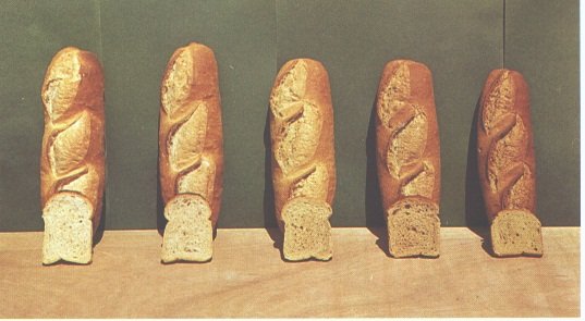 Figure 27. Pains contenant du blé et du mil réalisés à la boulangerie expérimentale de l'ITA , Dakar Sénégal.De gauch à droite: ble 100%; ble 90% et mil 10%; ble 80% et mil 20%; ble 70% et mil 30%; ble 60% et mil 40% . (Photo: Mr. H. Perten).