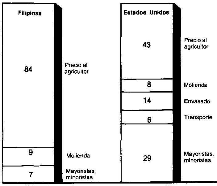 Es necesario proceder con cautela al elaborar conclusiones a partir de los porcentajes relativos a los márgenes de mercadeo. Los cultivadores de arroz de Filipinas y de muchos otros países en desarrollo reciben una proporción mayor del precio minorista pagado por el consumidor que los cultivadores de los Estados Unidos. A primera vista puede parecer que el agricultor americano se encuentra en peores condiciones debido a la proporción del margen total que corresponde al costo del envasado (véase la Figura 1). Sin embargo, en Estados Unidos la venta del arroz al por menor sin un envasado previo desalentaría el consumo y aumentaría el margen total debido al elevado costo de la mano de obra necesaria para su venta al por menor.