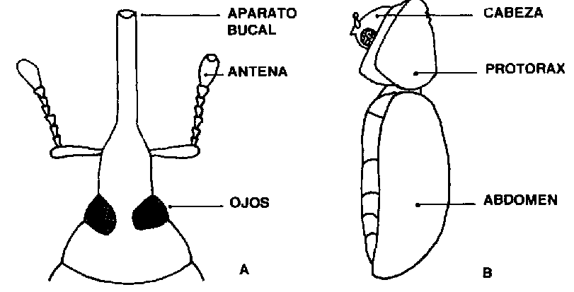 El cuerpo de los insectos se divide en tres partes o tagmas: cabeza, tórax y abdomen que están unidos entre si; los órganos internos se extienden de un extremo al otro del cuerpo. En la cabeza se encuentran localizados el aparato bucal, antenas y ojos. Las alas y patas están en el tórax. El abdomen es segmentado, generalmente sin apéndices salvo en el caso de algunas larvas que poseen falsas patas (Figura 1).