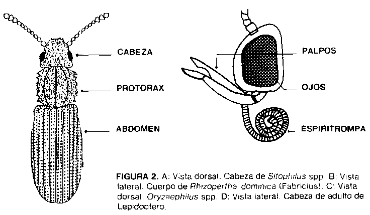 APARATO BUCAL. El aparato bucal de los insectos puede ser de varios tipos; el masticador es el más común en aquellos que dañan granos y productos almacenados (Figura 4). Esta compuesto entre otras partes, de un labio superior o labrum, un labio inferior o labium, dos pares de mandíbulas y las maxilas o mandíbulas auxiliares que ayudan a sujetar y a masticar los alimentos. Los coleópteros y las larvas de lepidópteros tienen este tipo de aparato buscal.