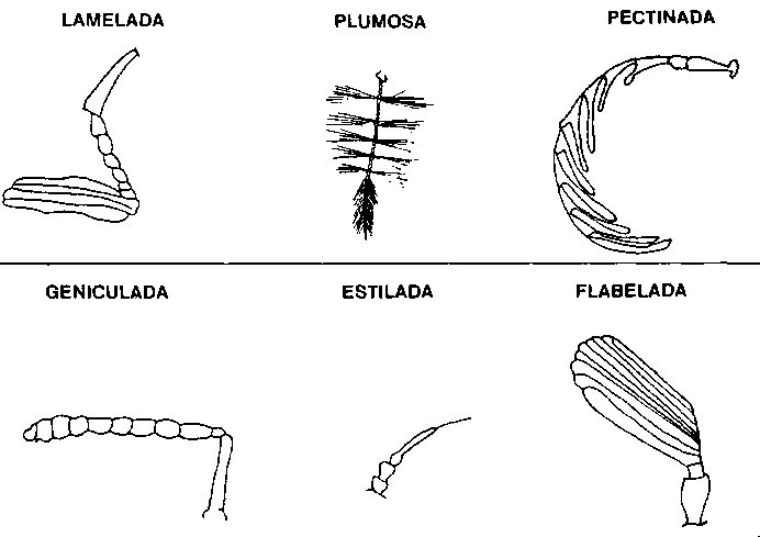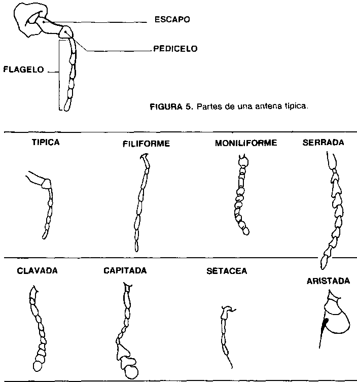 ANTENAS. Son apéndices muy movibles, localizados en la cabeza, delante de los ojos o entre los mismos, formados por varios segmentos, en donde residen las funciones sensoriales del tacto y del olfato. El número de segmentos, su forma y largo son usados como parte de las características para distinguir las diferentes especies (Figuras 5 y 6).