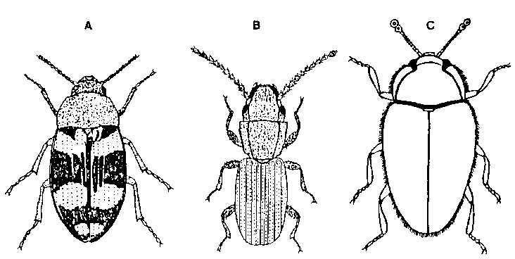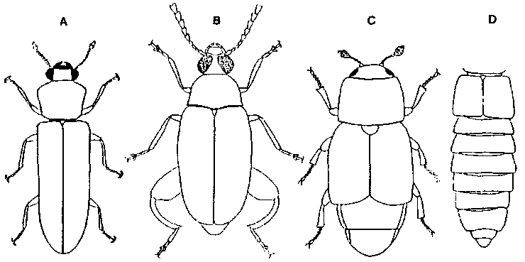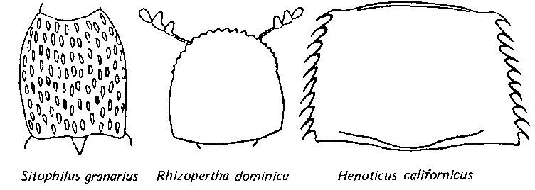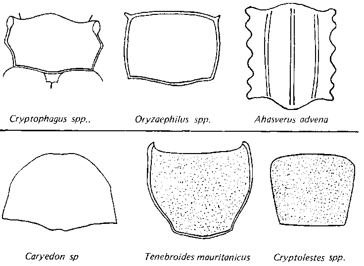 FIGURA 7. Diversas formas de protórax de algunos insectos de granos almacenados.