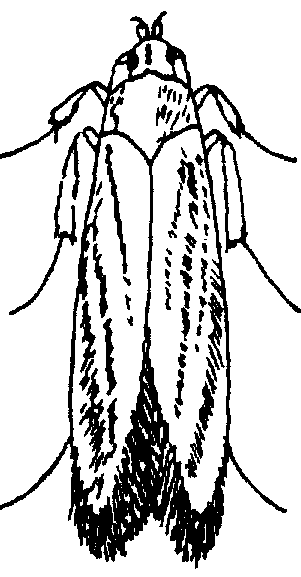 Cuando están en reposo la mayoría de los lepidópteros de granos almacenados pliegan sus alas en forma de techo a lo largo del cuerpo (Figura 1 1).