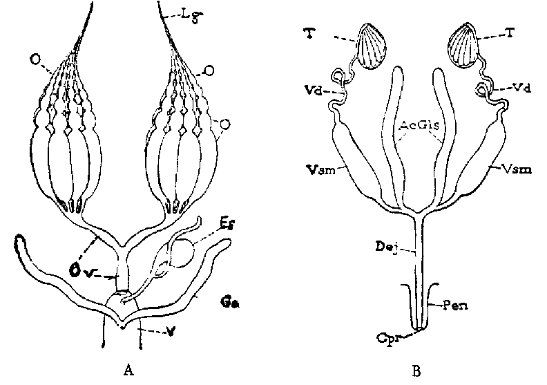 En los machos el sistema reproductor interno consta de dos testículos con dos vesículas seminales y un conducto eyaculador que se termina en el edeago (Figura 19).