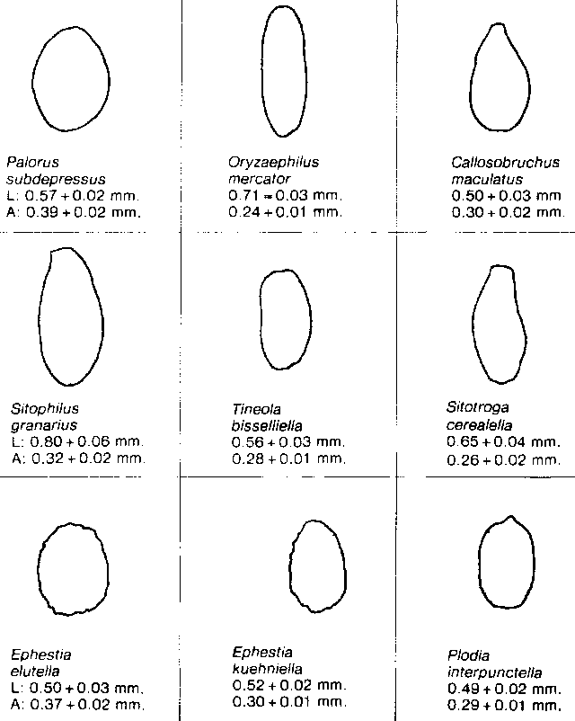 Los insectos que se desarrollan en granos y sus productos almacenados, son de tamaño pequeño; por lo general miden de 2 a 5 mm de longitud, aunque algunos llegan a alcanzar 8 a 12 mm.
